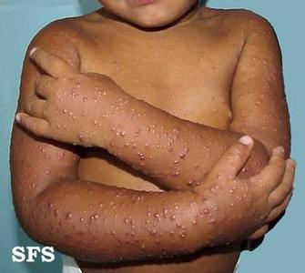 成年病人好发部多为四肢屈侧,扁平丘疹有瘙痒,以后融成斑块,表面干燥其上有鳞屑,常有皮肤剥脱和色素沉着。